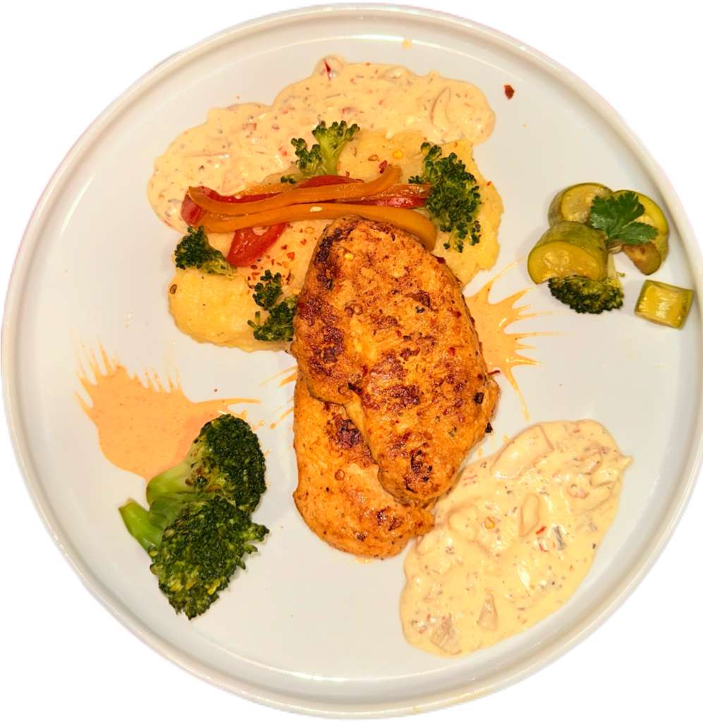 A succulent chicken steak, grilled to